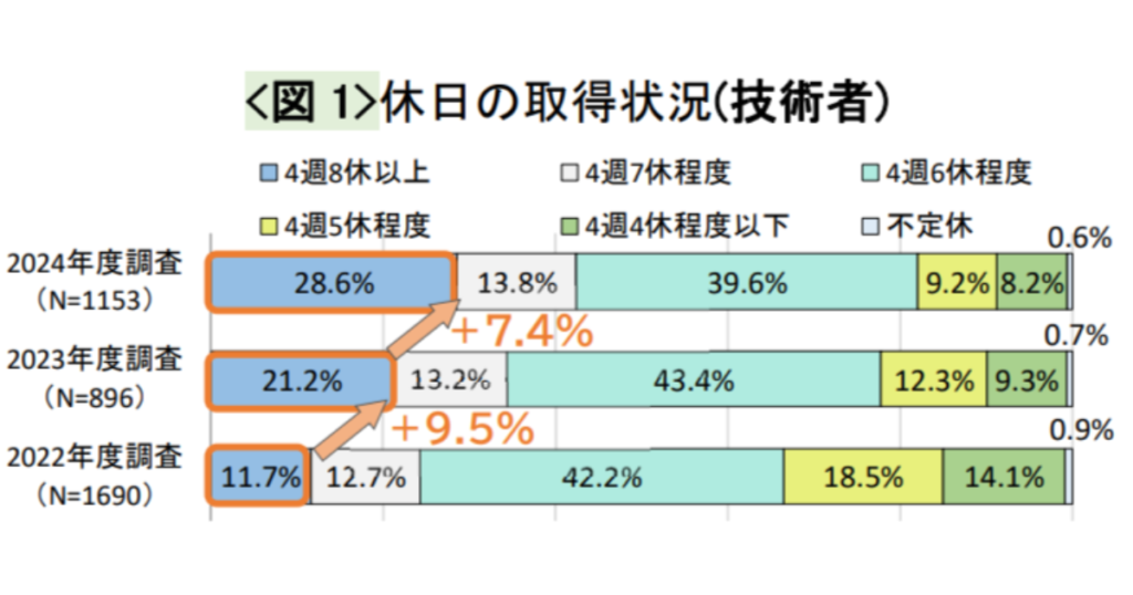 背景には、建設業の休日取得数の少なさがあります。令和6年度の国土交通省調査によると、4週8休以上を取得している割合は、28.6%にとどまっており、最も多いのは4週6休の39.6%という状況です。