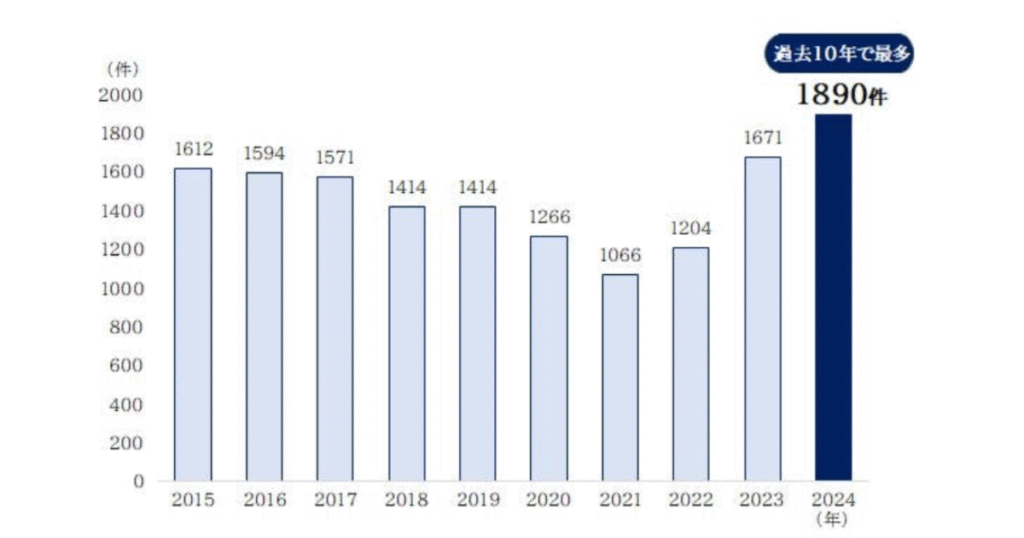 2024年における建設業全体の倒産件数は1,890件にのぼり、コロナ禍以降増加傾向にあります。