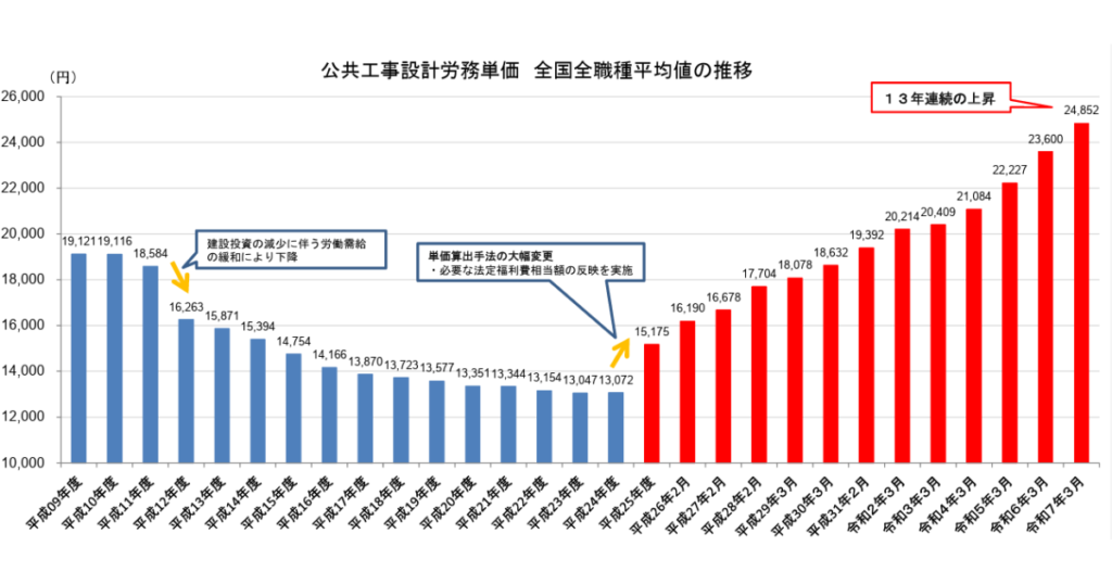 ※参考:令和7年3月から適用する公共工事設計労務単価について(国土交通省)